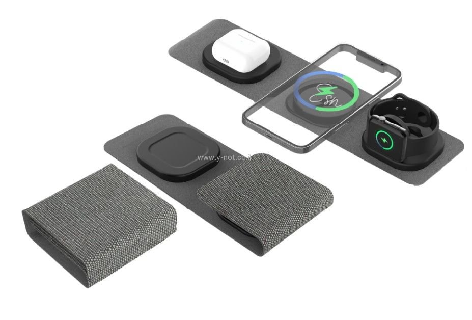 מספק טעינה אלחוטית בו זמנית לשלושת המוצרים חוסך מקום ומותאם במיוחד לנסיעות.