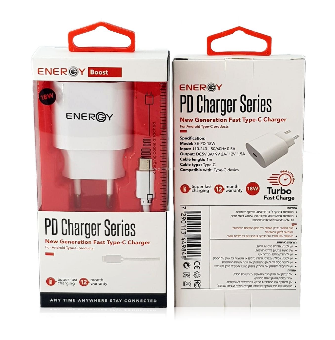 מטען בית מהיר 18W עם יציאת USB C – תומך PD – מבית ENERGY