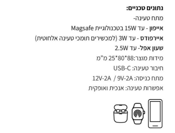 · טעינה מקבילה לשלושה מכשירים בו זמנית בטכנולוגיית Magsafe (בהתאם למכשירים התומכים)