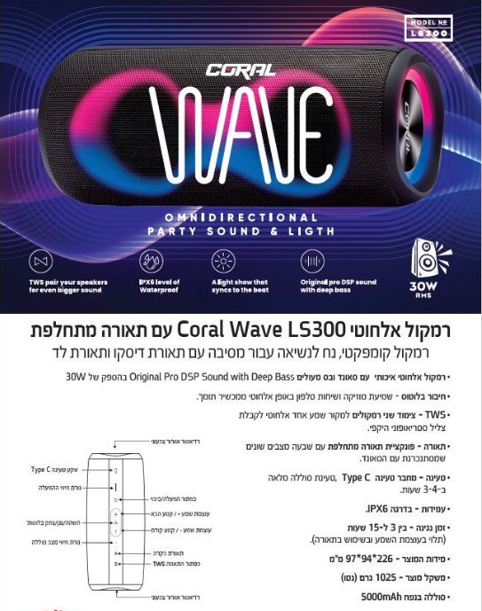 רמקול אלחוטי -CORAL WAVE L300 עם אורה מתחלפת.