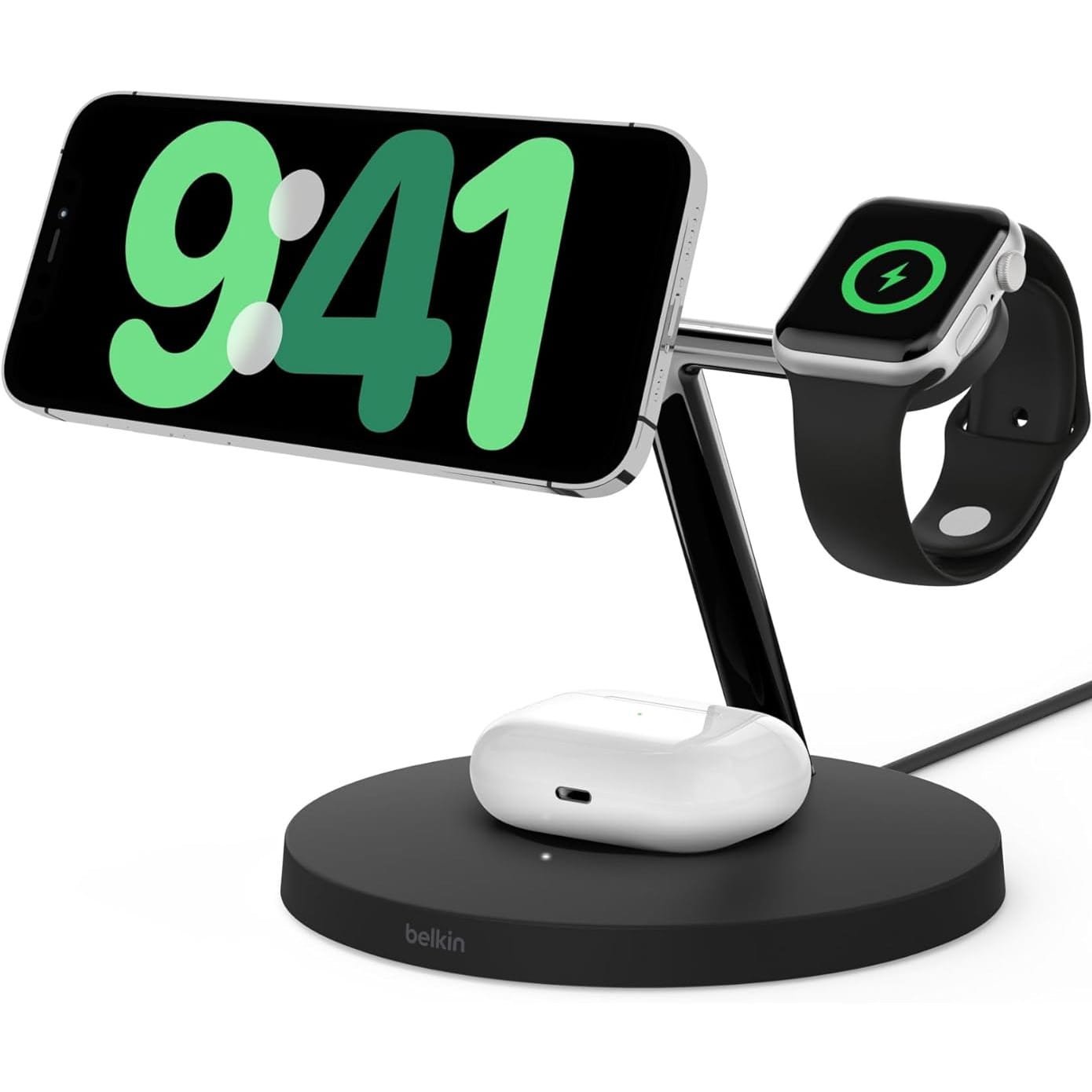 משטח הטעינה המתקדם של בלקין מציע טעינה אלחוטית מהירה עד 15W בטכנולוגיית MagSafe לאייפון 12 ומעלה ; לאוזניות AirPods ולשעון Apple Watch.
